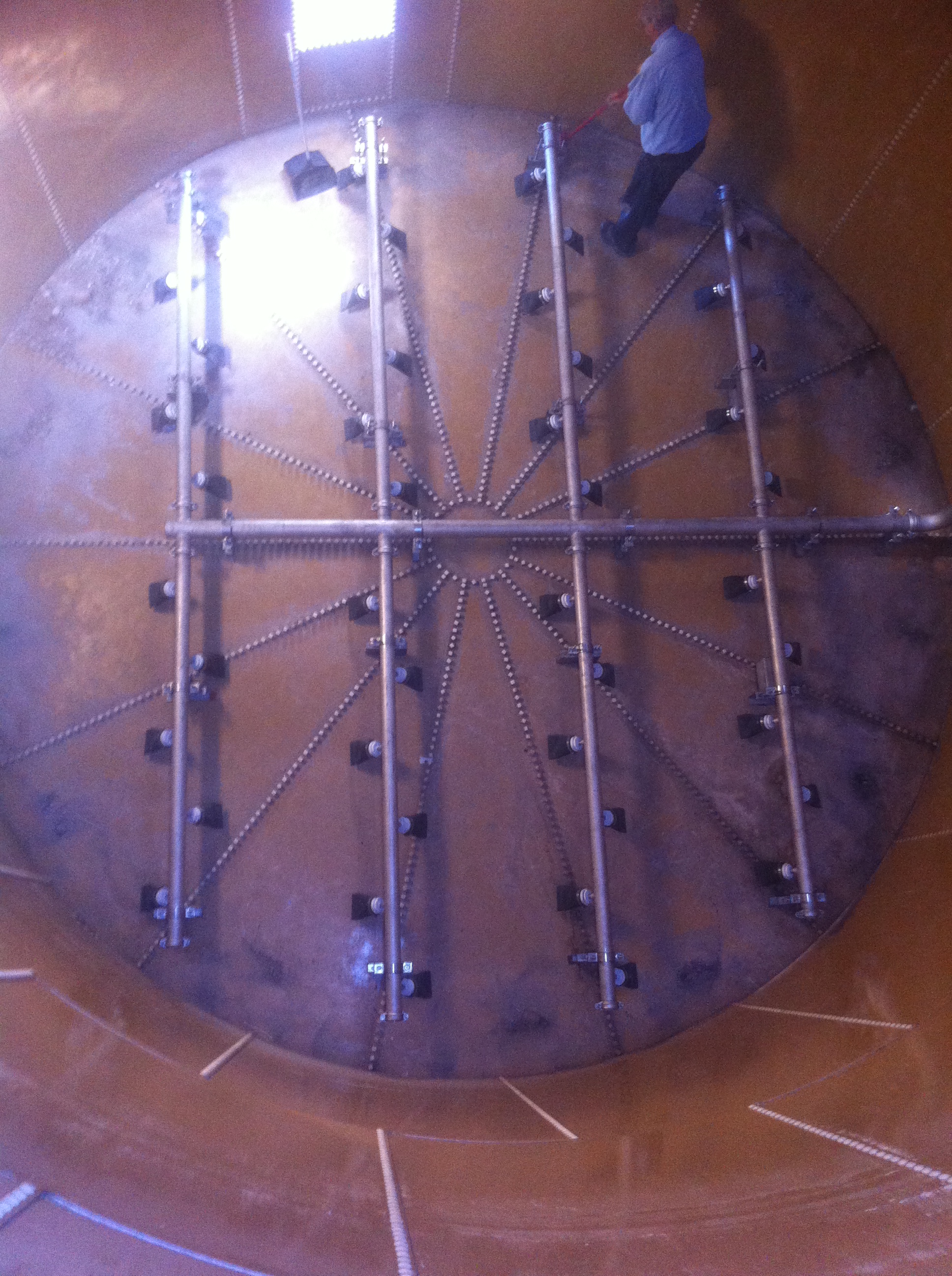 Albert Foods stores its process wastewater in an equalization tank so flow can be metered and equalized in transfer to the local POTW. Food processing wastewater residual BOD levels can be very high, accelerating the transition to anoxic and septic conditions. Another challenge of this project was the existing enamel-coated bolted steel storage tank which complicated equipment retrofit installation.